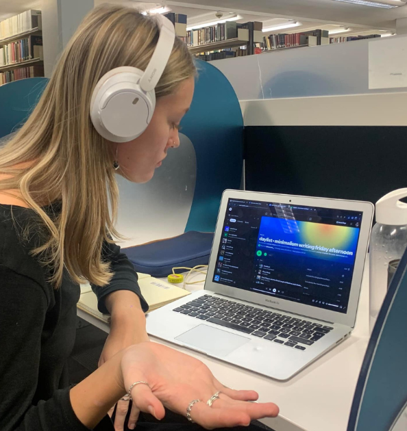 Two laptops, one playlist, zero productivity. They sit across from each other in a pod, pretending to work while exchanging meaningful glances every five minutes. Everyone can feel the tension, but is too polite to acknowledge it. Their essays remain untouched, but the emotional damage? Ongoing.