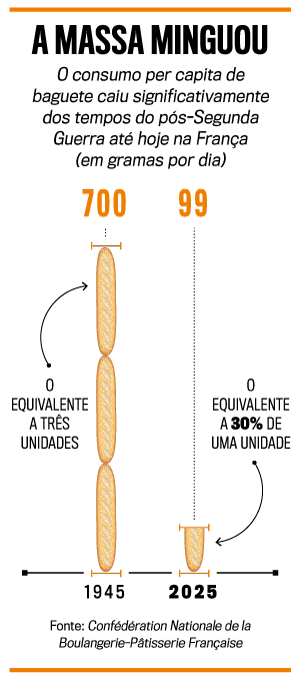 O pão que nunca sai de moda, porém, anda sofrendo abalos diante dos ventos da vida moderna. Se na era pós-Segunda Guerra, em 1945, o consumo per capita diário era de três unidades, hoje a porção é de um terço (veja no quadro). Uma das explicações é que até os franceses, que não poupam na manteiga e bebem vinho à vontade, estão freando a ingestão de carboidratos, uma onda global. Fora essa questão comportamental ligada aos cuidados com a saúde, há a concorrência. A baguete passou a dividir a clientela desde a entrada em cena das chamadas neoboulangeries, padarias comandadas por chefs afeitos a fermentação natural, grãos refinados e uma boa farinha orgânica. Sim, elas também oferecem baguete, mas muitas vezes não são mais o carro-chefe nas vistosas vitrines. A busca por novidade atende a uma demanda do exigente paladar francês: 56% acham que a qualidade do pão de cada dia não melhorou nos últimos anos, segundo levantamento da Confédération Nationale de la Boulangerie-Pâtisserie Française (CNBPF).