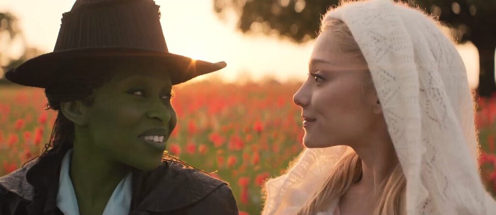 Everyone loves the final frame of the film, a wholesome flashback which sees Glinda and Elphaba sitting in a poppy field during their university days. In the scene, Glinda, wearing a white shawl, whispers something into Elphaba’s ear, and this recreates the iconic Broadway musical poster that everyone knows and loves.