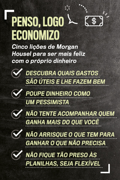 Housel cresceu em uma casa de orçamento apertado enquanto o pai estudava medicina. Mesmo com a posterior melhora financeira, a família optou por hábitos modestos, uma das lições valiosas abraçadas pelo economista: ele bate na tecla de que a aparência e o status não são motivações válidas para quem quer ser próspero (leia mais no quadro). “Se ninguém pudesse ver as roupas que usamos, os carros que dirigimos ou a casa em que moramos, provavelmente gastaríamos o salário de outro jeito”, defende. Segundo o escritor, há duas maneiras de enriquecer: uma é se sacrificar mais, a outra é almejar menos. “Nenhuma delas é divertida”, conclui. Eis aí uma dura e sincera sabedoria financeira.