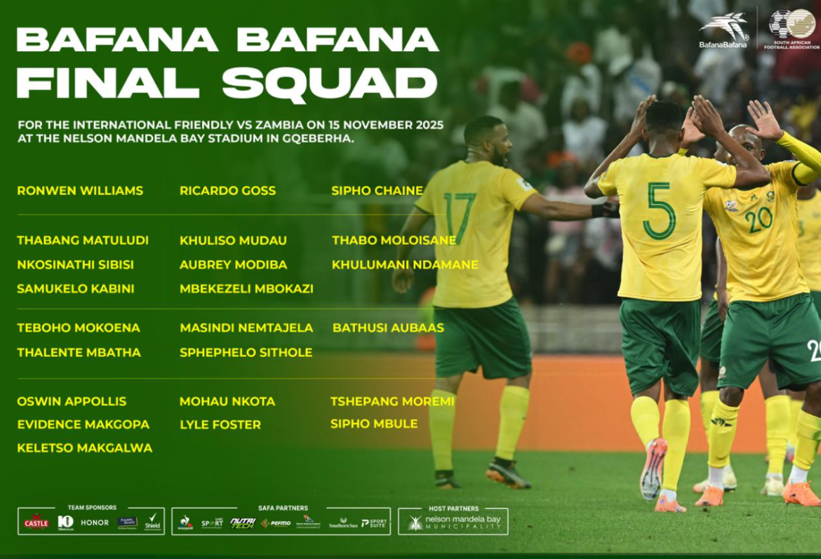 Bafana Bafana head coach Hugo Broos has announced his 23-man squad for the upcoming friendly fixture against Zambia, set to take place on Wednesday, 15 November, at the Nelson Mandela Bay Stadium in Gqeberha.
