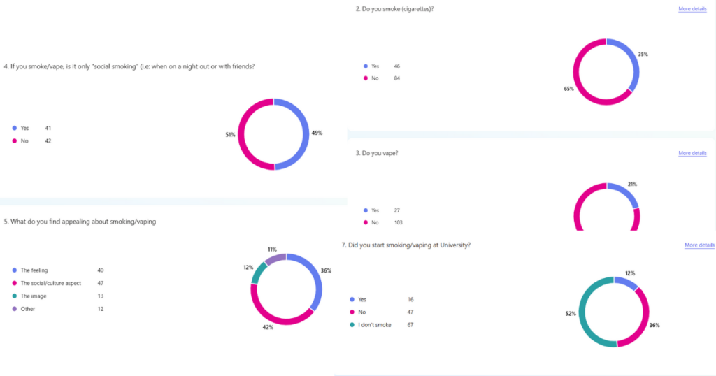 Out of the 130 responses recorded, 35 per cent of students reported they smoked cigarettes, and 27 per cent reported they vaped. This might not sound like that much, but according to the Office for National Statistics, only 9.8 per cent of 18 to 24-year-olds in the UK are smoking (with similar stats for vapes).