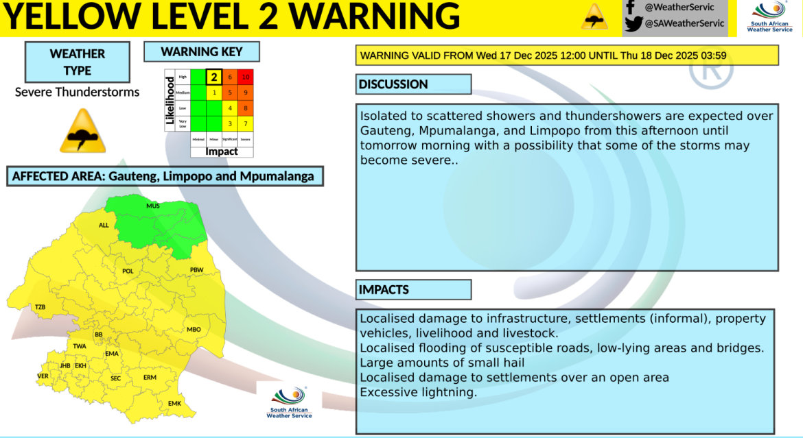 - A yellow level 2 warning is in effect for Gauteng today, with severe thunderstorms threatening localised flooding and infrastructure damage.