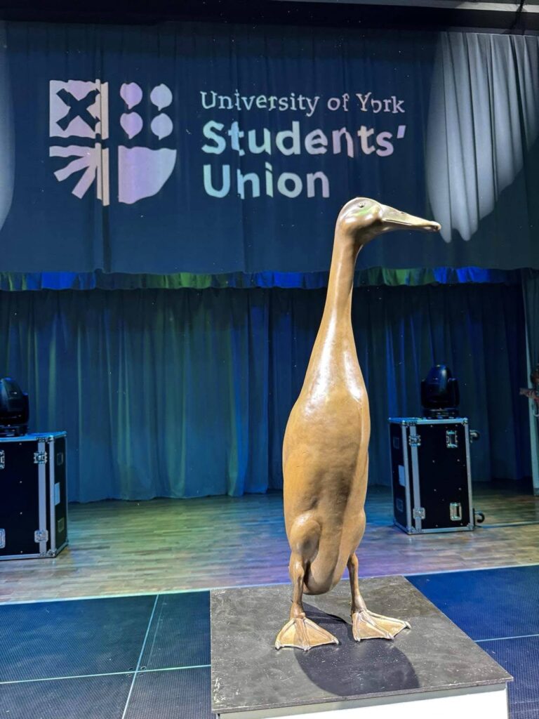 Often found strutting around Derwent College and Heslington Hall, Long Boi became a familiar and much loved presence for students and staff, many of whom would stop to feed him and his duck friends. His fame properly took off in 2021, when he was featured on The Late Late Show with James Cordon, introducing American audiences to York’s tallest duck.