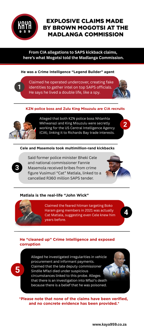 The post INFOGRAPHIC: Explosive claims made by Brown Mogotsi at the Madlanga Commission appeared first on KAYA 959.