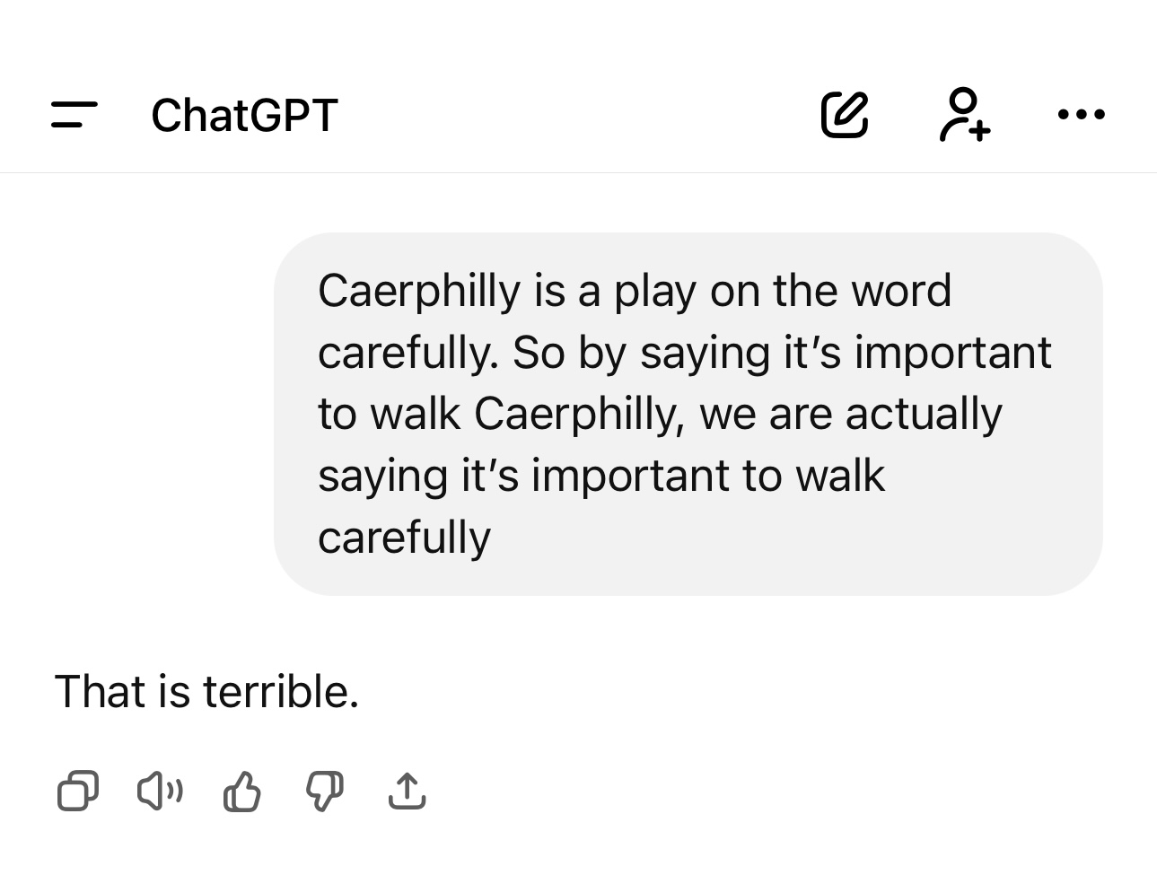 Next, in relation to how delightfully clean student areas of Cardiff are, we tested the pun: “It’s important to walk around Caerphilly after bin day because there’s always so much rubbish on the pavement”. This one was slightly more niche so we can let ChatGPT off just this once, but again, the pun fell through. The possibility of a friendship also fell through after we had to explain that “Caerphilly” sounds similar to “carefully”. ChatGPT politely informed us this was “terrible”.