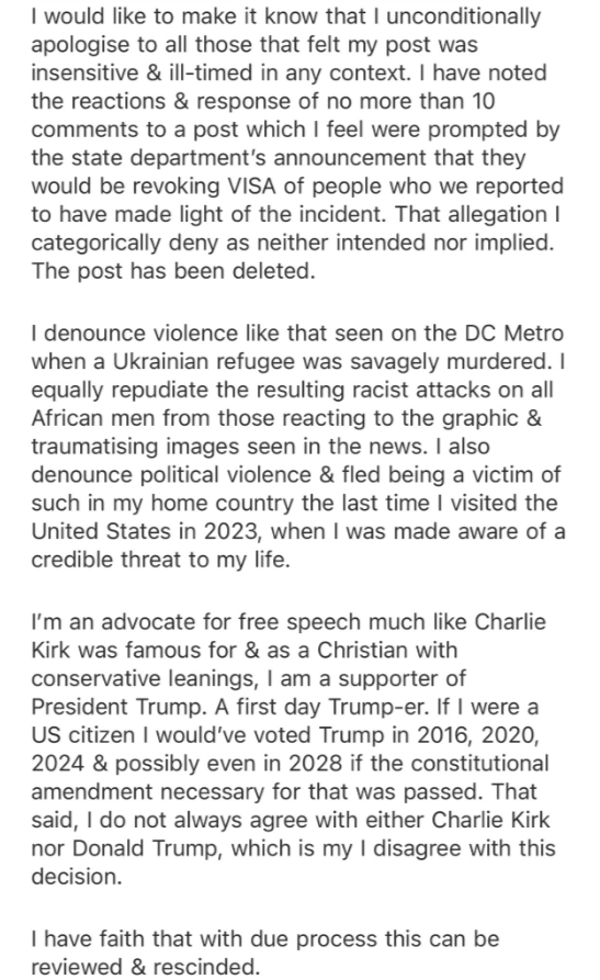 Following the backlash and the visa revocation, Baloyi posted an unconditional apology, stating he was “categorically deny[ing]” any intent to make light of the incident. He has since deleted the original post.