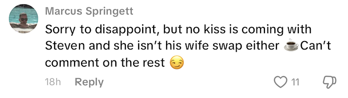 Commenting on a video by gossip account JetSetGypsea explaining the drama, he said: “Sorry to disappoint, but no kiss is coming with Steven and she isn’t his wife swap either Can’t comment on the rest.”