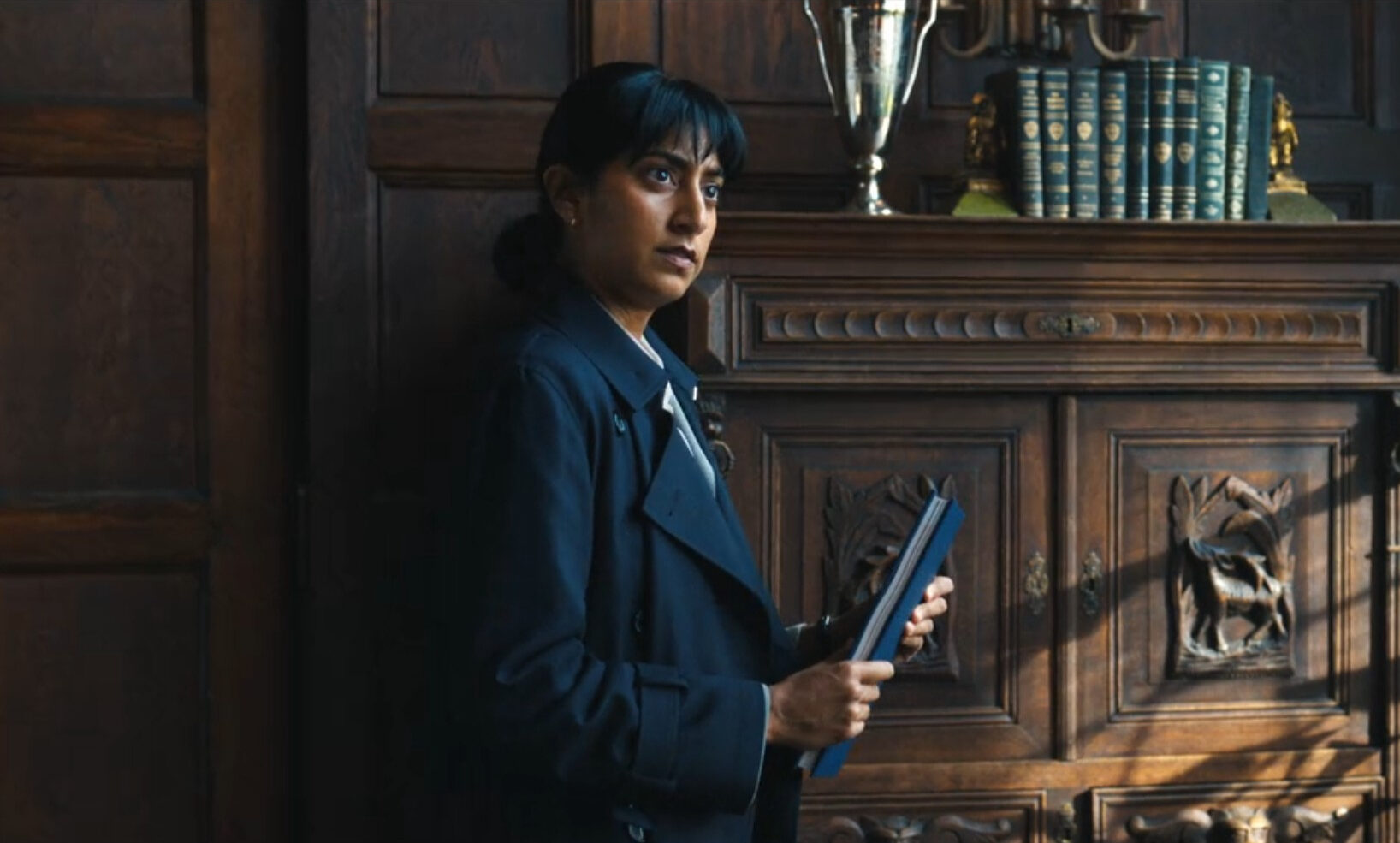 The secondary detective, Priya, is told, “No fingerprints anywhere. Not even the victim’s.” She responds, “Whole place wiped clean? Maybe we are looking at a professional.”