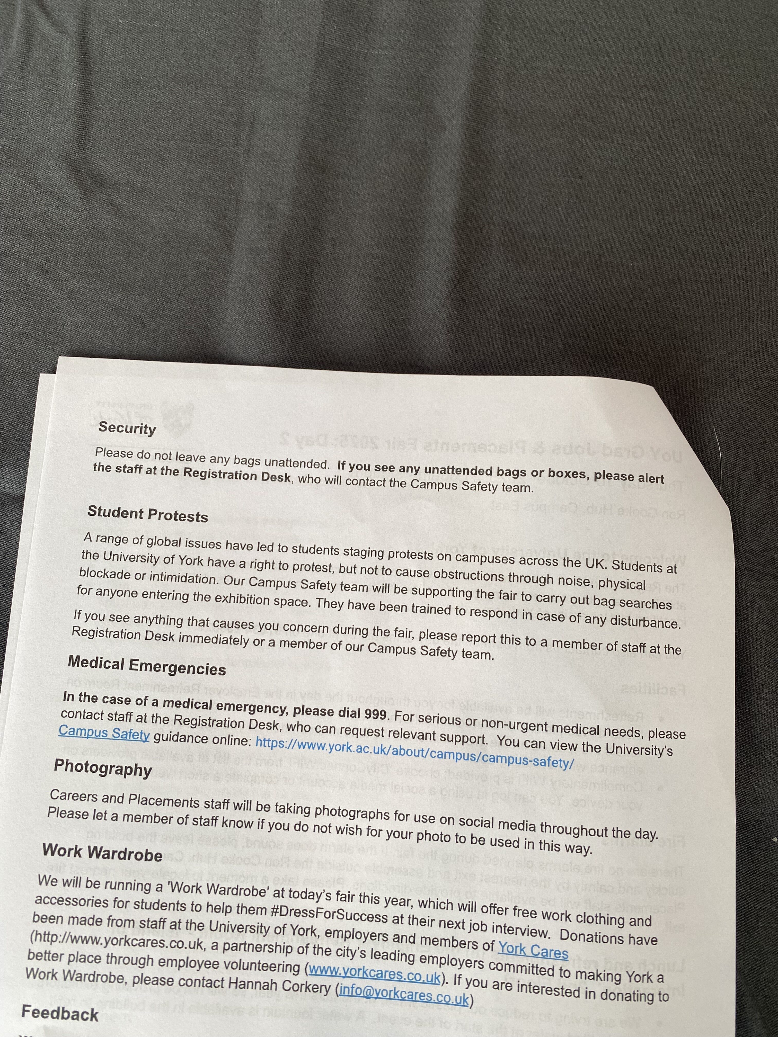An information booklet was handed to all employers stationed at the fair. One section warned about the possibility of protests. Under this section, it said: “Students at the University of York have a right to protest, but not to cause obstructions through noise.